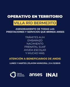 Este lunes y martes, en el playón municipal, de 8 a 12:30 hs, se llevará a cabo un operativo integral de asesoramiento y atención para vecinos de Villa Río Bermejito.
