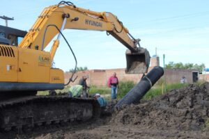 Operarios comunales realizan la tarea de colocar un caño peat de 0-60 por debajo de la avenida Hernandarias y así permitir que se escurra el agua acumulada en el barrio ubicado del lado contrario al canal Hernandarias; por el que luego es direccionada hacia el Canal 16. Es la primera vez que se está haciendo para descomprimir el agua de un sector con problemas importantes de anegamientos e inundaciones.