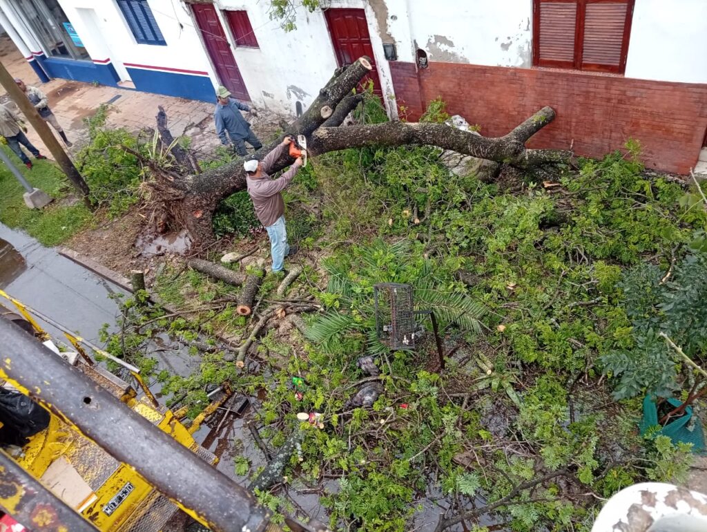 Paralelamente, las cuadrillas de Servicios Públicos trabajan en la recolección de ramas y árboles caídos como consecuencia de las fuertes ráfagas de viento.